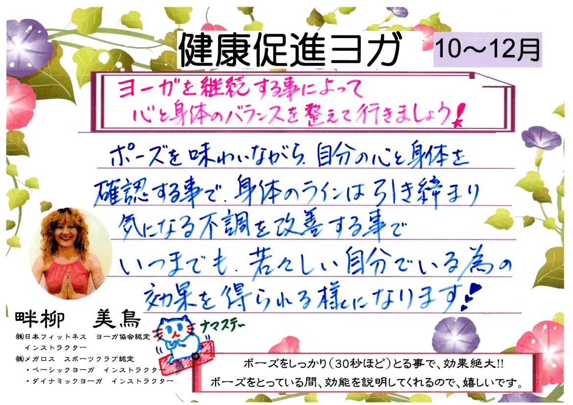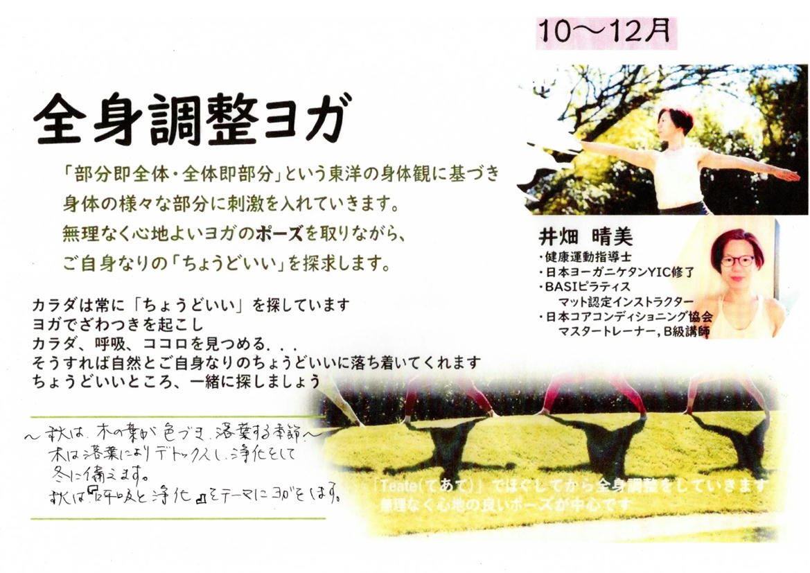 【朝】全身調整ヨガ(井畑) 【夜】アロマ ボールエクササイズ(元田) |