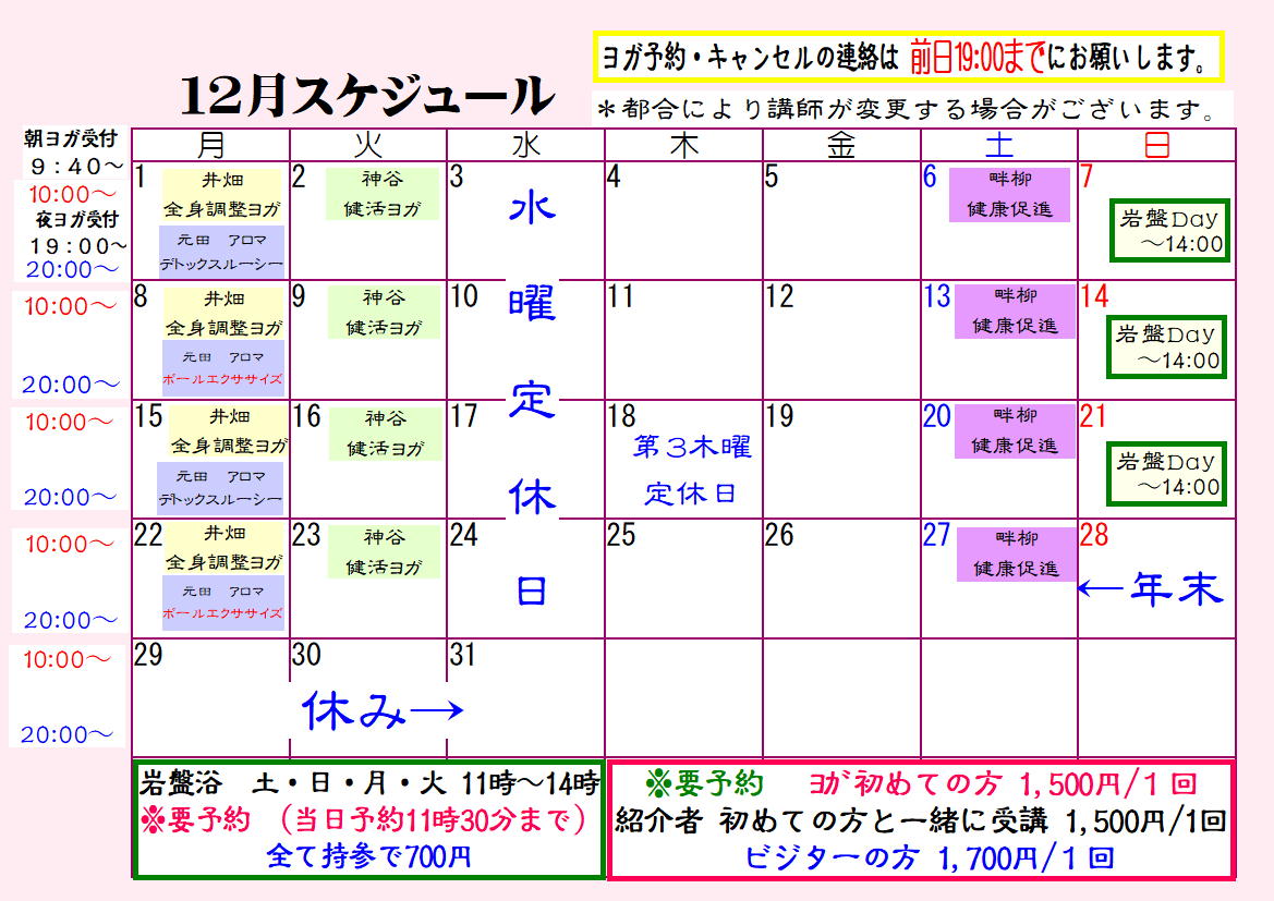 【朝】全身調整ヨガ(井畑) 【夜】アロマ デトックスルーシー(元田) |
